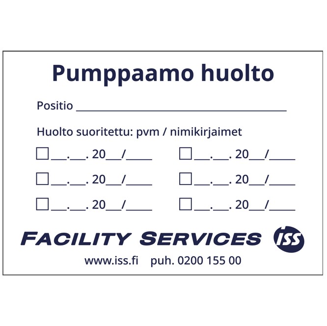 Kirjoita ensimmäinen arvio tuotteelle “PUMPPAAMOHUOLTO tarra 100x70mm”