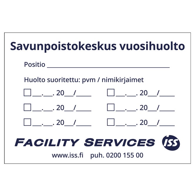 Kirjoita ensimmäinen arvio tuotteelle “SAVUNPOISTOKESKUKSEN VUOSIHUOLTO tarra 100x70mm”